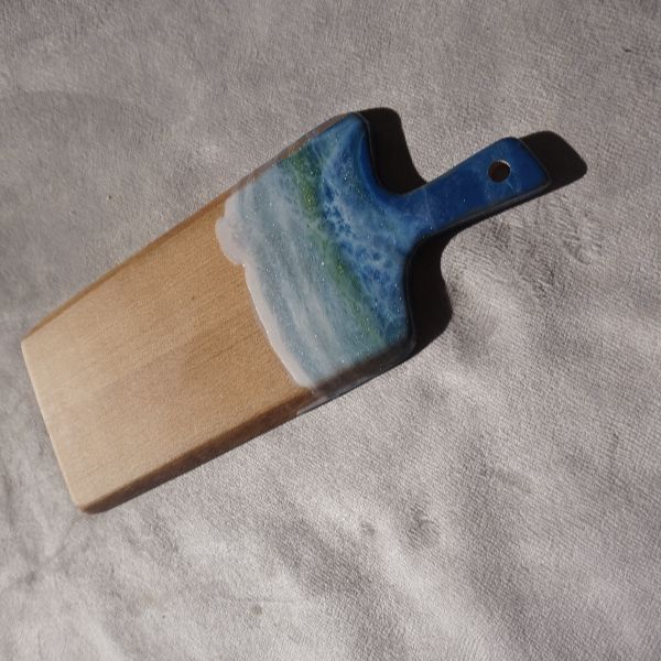 A termék 2 darab szélezetlen bükkfából áll , így meghagyva a természetes vonalait. Majd erre került egy dísz-epoxi öntés a fogórésztől indulva a vágódeszka 1/3-ig.